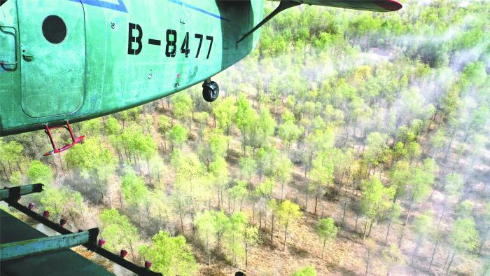 4月14日,一架农用飞机在第一师10团防风林带上空喷洒杀虫剂。自4月上旬以来,兵团对叶尔羌河、塔里木河流域的第一师、第二师和第三师的35万亩野生胡杨林和人工林实施飞防,有效控制食叶害虫对野生胡杨林和人工林的危害 王志清摄