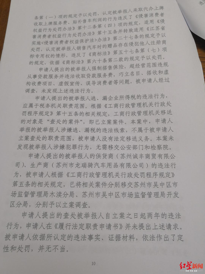 其提供的【2017】苏工商复字第74号行政复议决定书显示,苏州市工商行政管理局称,在调查过程中,未发现风顺公司有强制搭售保险、超经营范围违规从事贷款服务并违法收取贷款服务费等问题,而对于“收取上牌服务费、贷款服务费是否构成物价违法,已将相关线索移交给苏州市物价局”。