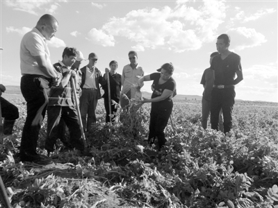 | 北京凯达公司通过订单扶贫的方式提高贫困户种植技术,图为2018年8月技术人员为前旗三岔口乡十六号村贫困户培训马铃薯种植技术。 |