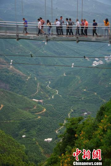 游客体验高峰生态谷的高空玻璃栈桥。 龚雯 摄
