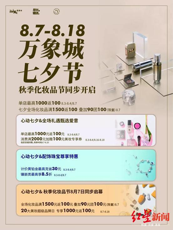 国际大牌彩妆、贵妇牌护肤品、气味芬芳的香体系列产品……正值七夕周,各大品牌都推出了不少限定款和礼盒,8月7-8月18日,成都万象城除了各大品牌超值折扣之外,还准备了满1000元返100元、满1500元返100元和满赠促销活动,包括Bobbi Brown、Make up for ever、M.A.C、雅诗兰黛、科颜氏等品牌。