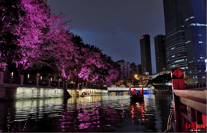 乘船从东门码头出发,悠扬的古乐环绕左右,临河建筑的画影再现了锦江商贸盛景。驶过东门大桥,打造“夜展、夜秀、夜游”三大主题,两岸沿线以河堤为画布,以杜甫诗作《春夜喜雨》“晓看红湿处,花重锦官城”为创意原点,用光影勾勒出动人的锦官城。