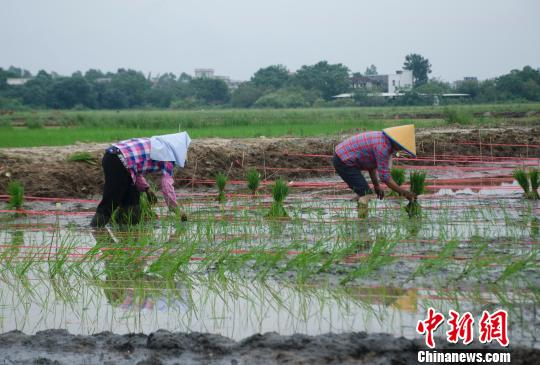 中新网北海8月23日电(翟李强)8月22日,在广西北海市合浦县山口镇高坡村和北界村之间的稻田里,袁隆平团队专家在指导当地农民进行海水稻的晚造秧苗插种。这片曾经因海水倒灌而丢荒了十多年的农田,因种植海水稻获得成功而焕发新生,今年早造海水稻亩产达400多公斤。