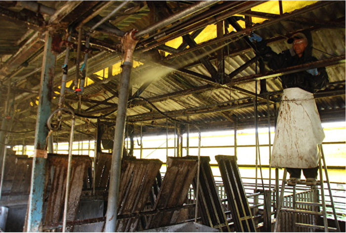 53岁的养殖户瓜生阳一正在为重启养殖场而认真地做消毒工作。养猪场顶棚的聚氨酯隔热板被认为是老鼠们的温床,现在已经全部被拆了下来,只剩下光秃秃的钢架。瓜生阳一甚至给这些钢架的槽里都做了消毒。