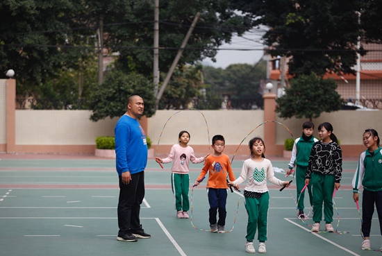 3月1日,广州,花都区七星小学,赖宣治在体育课上教学生跳绳。视觉中国供图