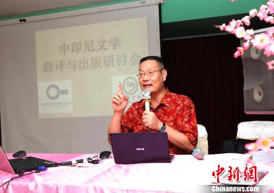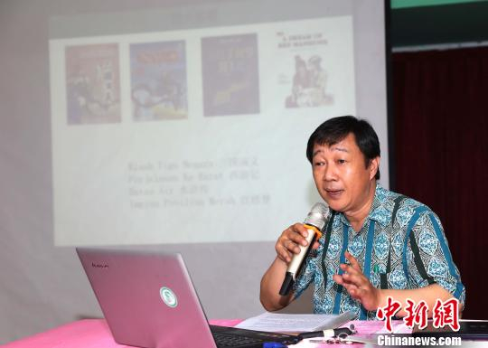 图为印尼高校中文系协会顾问、达尔玛博修达大学中文系主任刘兴权讲解中国文学在印尼传播情况。 林永传 摄