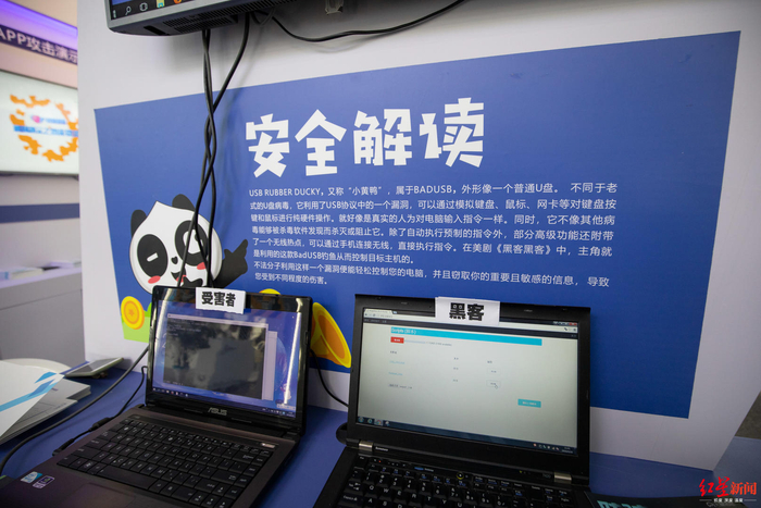 在成都启明星辰信息安全技术有限公司展示区,记者看到两台分别被标记为黑客与受害者的笔记本电脑,受害者电脑上插着一块黑色的U盘。在工作人员的演示下,黑客方利用U盘驱动的漏洞,在受害者电脑上建立热点,并通过黑客方的电脑在受害者电脑上打开了命令平台。从而使黑客能够远程操纵被害者的电脑。
