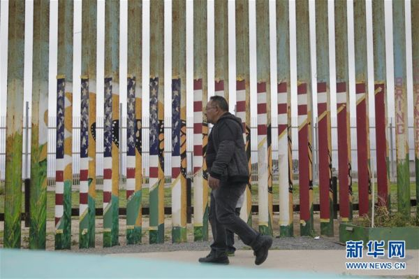 在墨西哥蒂华纳,居民从美墨边境墙前走过。新华社记者淡航摄