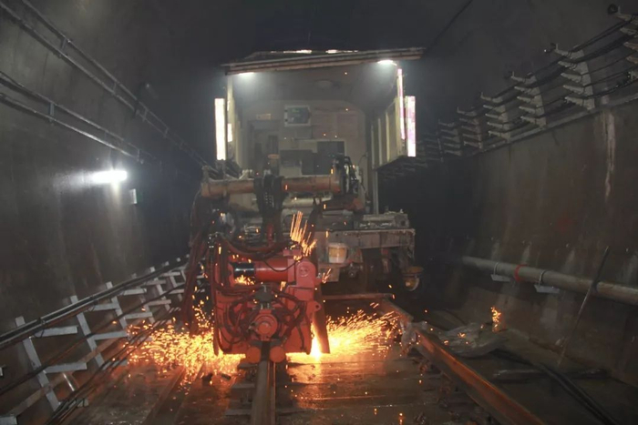 所谓长轨通,就是将之前已经铺好的短轨焊接,连成整体。八号线文化公园至凤凰新村区间双线轨道总约2.8公里,焊接接头共112对。