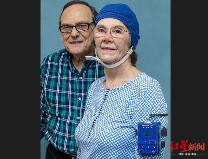 一名阿尔茨海默症患者在家属的陪伴下,穿戴着治疗设备接受试验时。图据《新闻周刊》