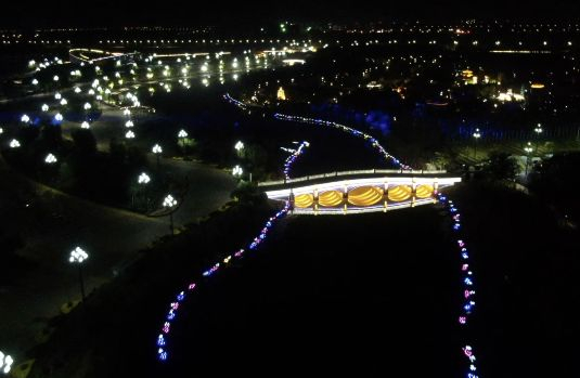 虹桥晓月:位于气膜馆附近,景点实现桥身灯光亮化,并首创直径达四米的人造月亮,营造一幅意境浓郁的银川夜色。驿埠水街寻风情,阅海湾上追明月。梦幻光影,镜花水月,映像出银川的历史文化,灵性地感悟着时代的变迁。