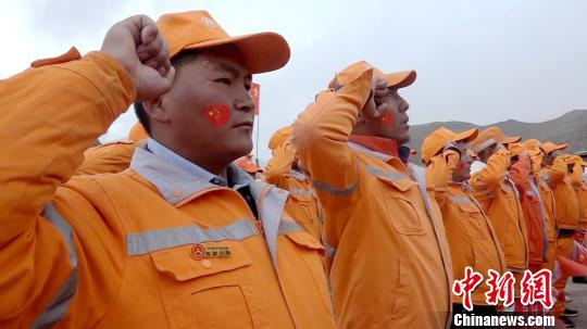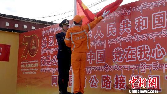 图为西藏阿里国省公路接管组在驻地举行升国旗、唱国歌,庆祝新中国成立70周年。 贡桑拉姆 摄