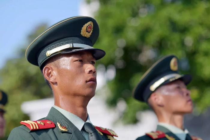 9月28日清晨5时许,刚刚结束彩排的机动支队国旗护卫队和军乐队回到了驻地。仅仅休息了4个小时,他们根据彩排情况开始了新一轮针对性练习。下午3时,国旗护卫队又准时出现在训练场上。整齐的步伐、挺拔的身姿,小伙子们身着橄榄绿礼服,黝黑的面庞上都是坚毅。