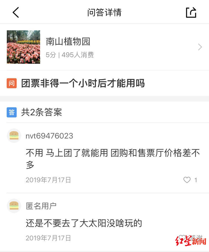 不过南山植物园的解释,让陈小姐还是没弄明白,为啥预售就要等1小时,而在其他景区就没有遇到过类似的情况?红星新闻记者拨通了南山植物园的公开电话,值班工作人员告诉记者,“等1个小时是因为要等网络平台到账。在网上买票,就像逛淘宝,下单之后钱放在了第三方的‘支付宝’里面,然后要1个小时才能到植物园账上,钱到账了才能出票”,并表示规定并非只针对大众点评,“只要是网络购票,都要1小时”。