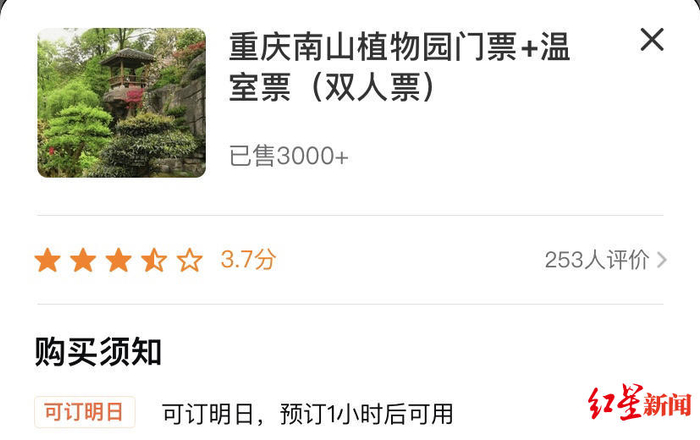 “我在网上看到重庆南山植物园评价很好,人也不多,还能拍出美美的照片。”90后陈小姐带着家里的老人去重庆游玩,特意挑选了重庆南山植物园,“比较适合老人家逛逛。”在停车场停好车后,陈小姐“按照惯例”掏出手机网上购票,“我注意到了有个购票1小时候才能使用,但是一看网友的评论,不用等也能验票进去,我就下单了。”