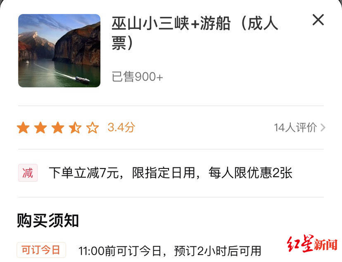 巫山小三峡+游船(成人票)网络购票,预订2小时候可用(大众点评截图)