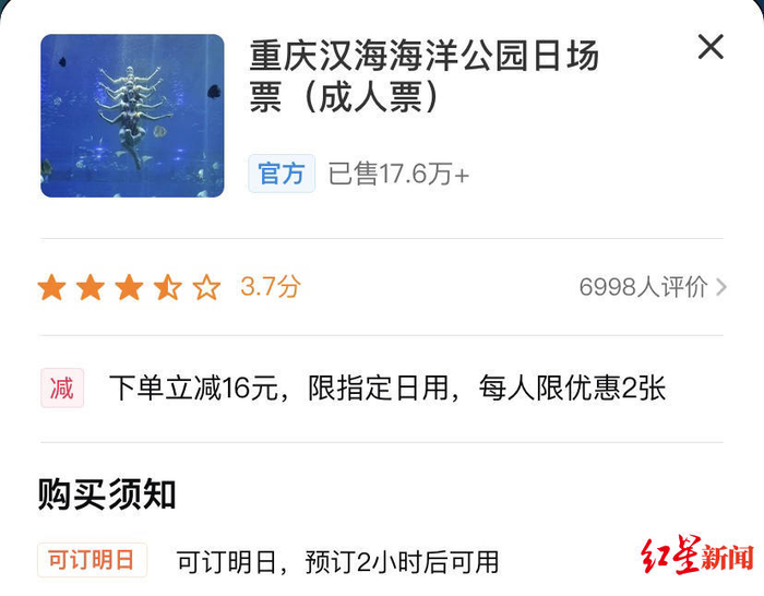 重庆汉海海洋公园网络购票,预订2小时候可用(大众点评截图)