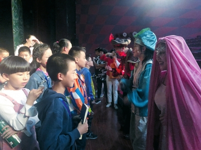 小记者张秀赫采访了舞台的演员:“舞台剧表演需要具备什么能力,在台上表演有什么技巧吗?”戒指精灵的扮演者认真地回答了他的问题。其他小记者也陆陆续续采访到了自己想要采访的对象,高品质地完成了山西晚报老师布置的全部采访任务。