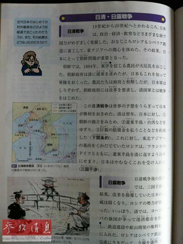 与前边几种教科书相比,日本书籍出版社的教科书令人耳目一新,它的2005年版描述为:“日本与朝鲜缔结不平等条约后,利用有利条件,逐渐向朝鲜扩张势力。……为了镇压农民军,朝鲜政府向清朝求助。这样一来,事先做好与清朝进行战争准备的日本也立即出兵朝鲜。日清两国出兵之时,农民军与朝鲜政府已经休战。但是,日本为了继续在朝鲜驻军,将改革案强加于朝鲜政府,朝鲜政府对此表示不满,于是日本占领了朝鲜王宫,并在攻击清朝海军之后,正式向清朝宣战,日清战争爆发。……在下关条约中,清朝承认朝鲜独立,割让辽东半岛与台湾给日本,并向日本支付高额的赔偿金。”我们看到,该教科书对于甲午战争的叙述还是比较客观的,编写者没有回避日本对于朝鲜的企图,也没有回避日本处心积虑要与中国一战的历史事实,甚至明确指出日本是甲午战争的发起者,并承认辽东半岛与台湾的获得是“割让”的结果。但令人遗憾的是这本教科书依然没有对甲午战争的性质作出判断,这一隐藏战争侵略性的行为模糊了受教者对于甲午战争的正确认识。