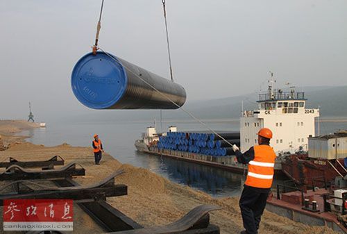 资料图片:“西伯利亚力量”是中俄主要合作项目之一。图为去年8月,工人在运送材料,为该项目启动做准备。