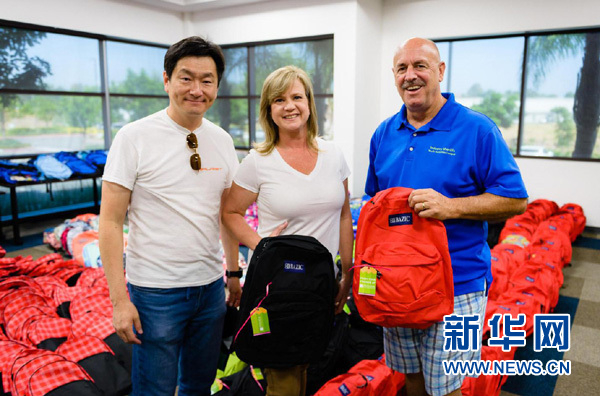 图中右一Sean Lee就是主要赞助人,他向受救助的孩子们提供850个书包和全部文具,他说:“之所以参与进来,并不是要得到什么,而是要真心为自己生活的社区做出贡献,看到这些家境并不富裕的孩子得到书包,那么高兴,就会感受到生活的价值。”