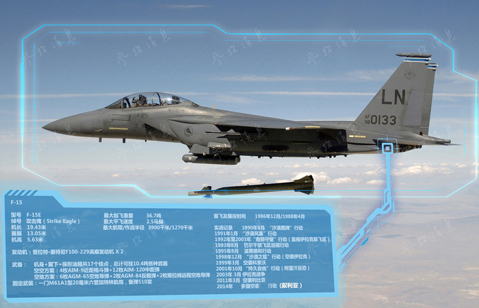 F-15E是原麦道公司在著名的F-15战斗机基础上改进而来的战斗轰炸机,在强化对地攻击性能的同时,仍能兼顾空对空作战能力,是美空军的几种主力机型之一。
