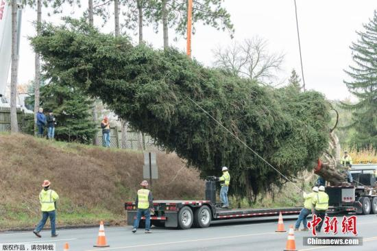资料图:当地时间11月9日,美国宾夕法尼亚州州立学院,75英尺高的挪威云杉树被砍伐后送往纽约的洛克菲勒中心,它将作为今年洛克菲勒中心的装饰圣诞树。