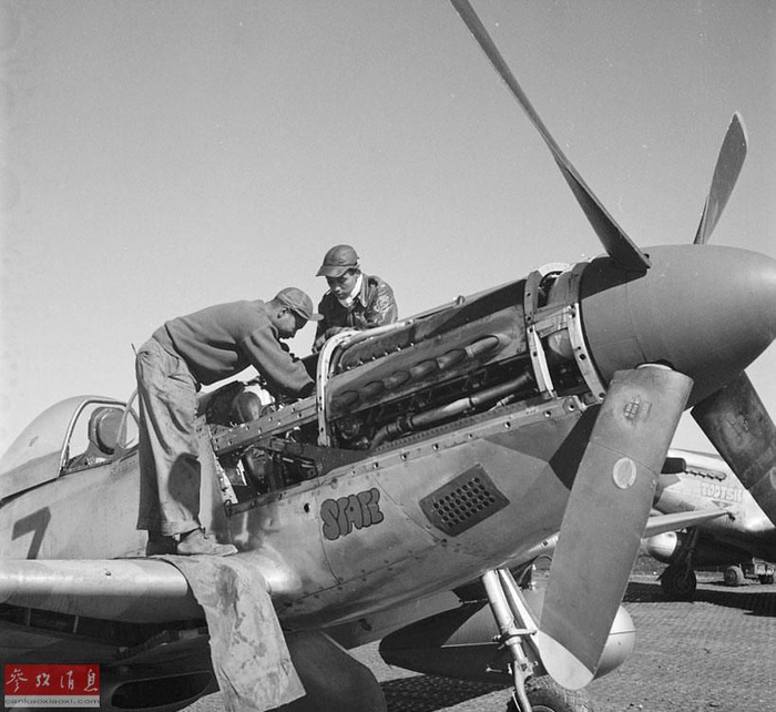 图为2名黑人技师史密斯和布朗正在检修战机。1943年4月,“塔斯克基”航空队奉命飞赴北非和西西里岛参战。在那里,他们对轴心国的地中海航运活动予以沉重打击。