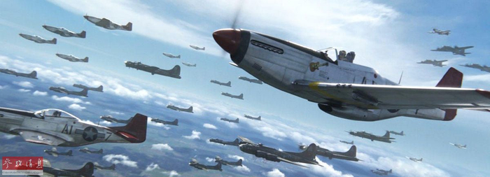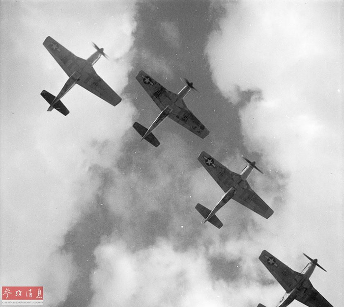 图为“塔斯克基”航空队的4架P-51“野马”战机组成了令人惊叹的完美队形凌空翱翔。在为前往轰炸轴心国目标的盟军轰炸机群护航的激烈空战中,“塔斯克基”航空队因战绩优异而被称作“红尾天使”。