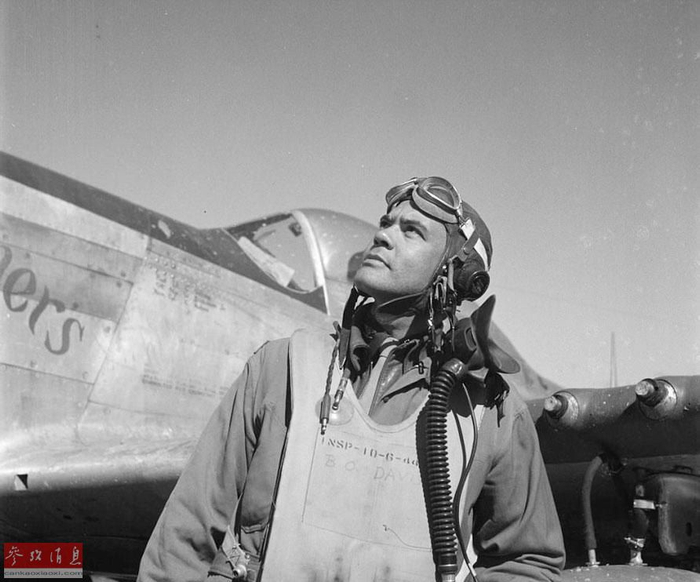 1945年3月,意大利,“塔斯克基”航空队指挥官本杰明·戴维斯上校在战机旁仰头凝视着天空,他也是该部资格最老的飞行员之一。