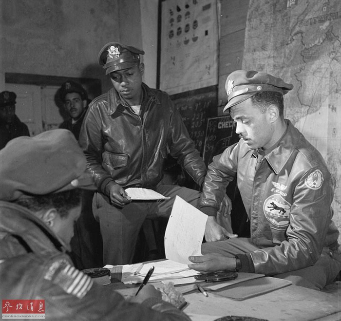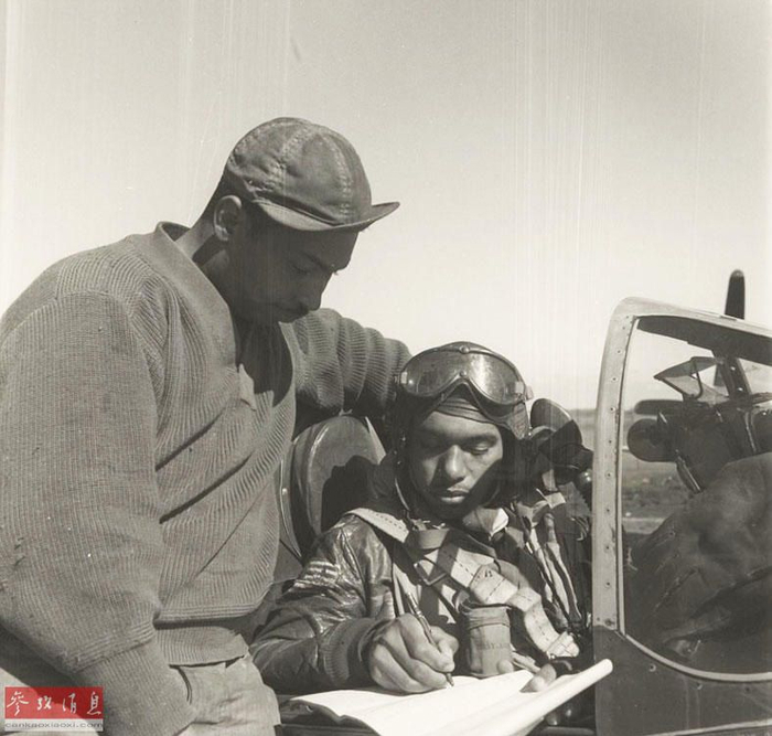 一名332战斗机大队的飞行员正在地勤交给他的手册上签名,以表示起飞前已确认飞机无异常情况。说起来,黑人飞行员的出现,还要得益于1939年美国政府颁布的一项拨款法案,前者旨在为那些愿意接收黑人学员的民用航校提供资金。