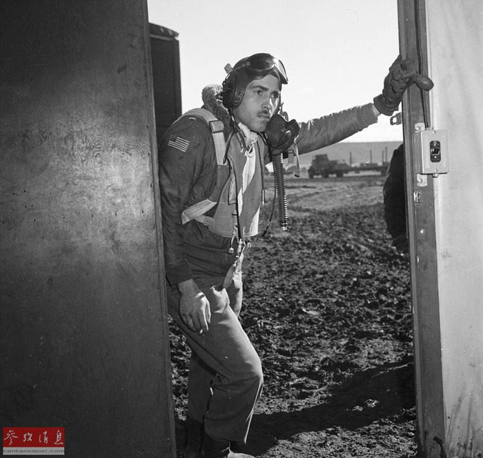 “塔斯克基”飞行员爱德华·托马斯(Edward M. Thomas)扒着门边,忙里偷闲抽根烟,由此可见激烈而危险的战斗任务,给他们造成的心理压力是很大的。