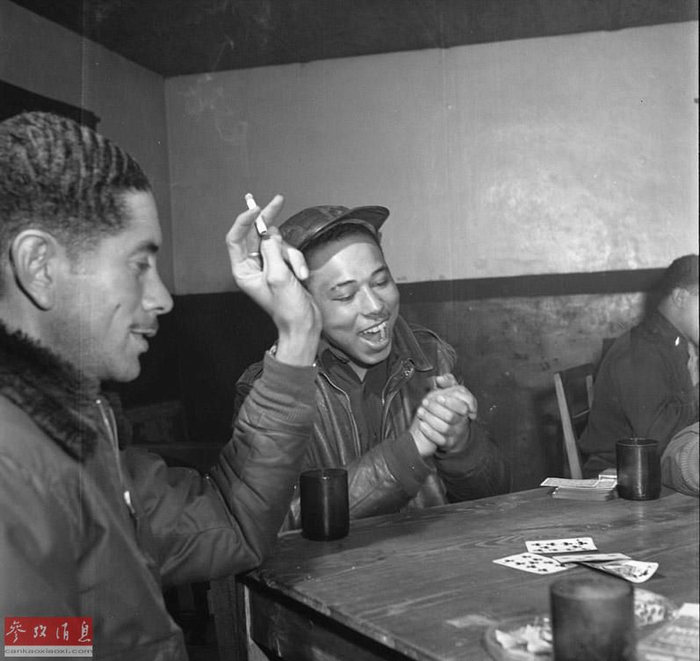 图为不参与战斗值班的“塔斯克基”飞行员晚上在军官俱乐部打牌娱乐。由于二战初期美国政府对吸纳黑人参军态度冷漠,甚至有一名黑人飞行员在入伍请求遭拒后,只好参加法国空军来实现自己的梦想。
