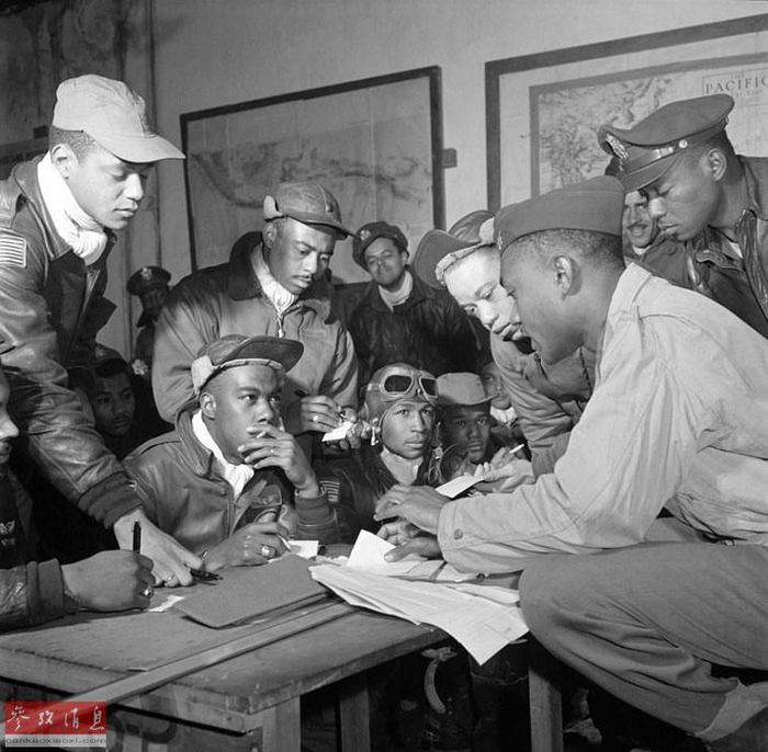 图为332战斗机大队的飞行员在位于意大利的空军基地参加简报会,他们正聚集在一张木桌前探讨战术。