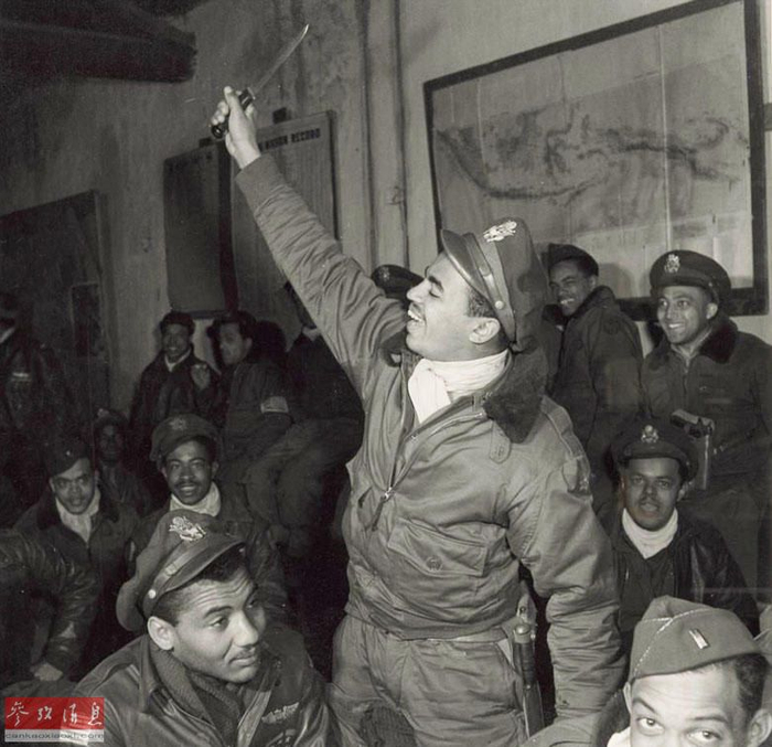 图为一名332战斗机大队飞行员的简报室里笑着举起一把刀。按照摄影师的说法,前者的举动“鼓舞人心”,展现了美军官兵“高昂的士气和坚定的战斗意志”。