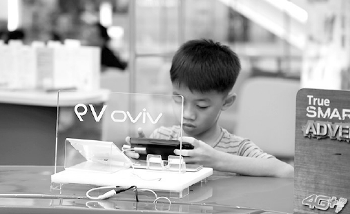 一个小孩在泰国电信运营商门店内用vivo手机玩游戏。