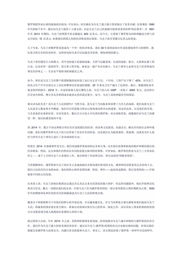 普京的文章开门见山,第一段就直接说:“俄罗斯人和乌克兰人同属于一个民族,我们是一个整体。”