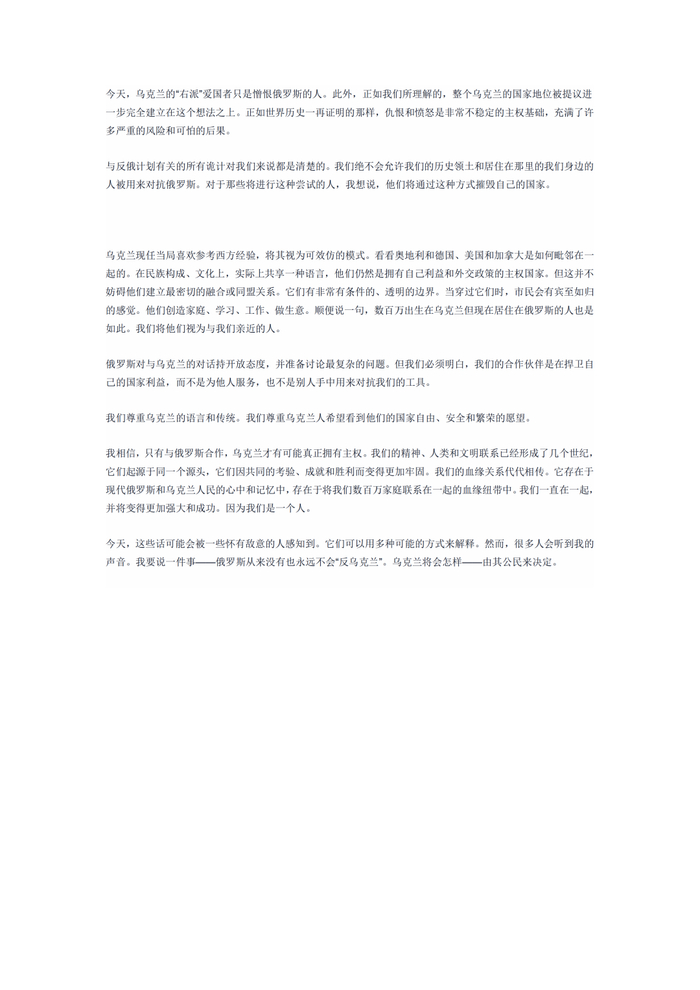 这篇文章言辞恳切,用倾诉和劝告的口吻,呼吁乌克兰人放弃对俄罗斯的仇恨和愤怒。所以在中文网络上,被网友们戏称为《告乌克兰同胞书》。