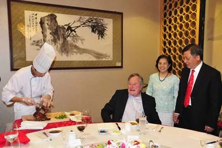在出使北京期间,老布什夫妇变身小吃货,尝遍了中国的各种美味佳肴。最爱的,就是“北京烤鸭”。回国后,布什夫妇仍然对北京烤鸭的味道念念不忘。甚至在二十年后在他们的金婚宴上,最抢眼的一道菜还是北京烤鸭。