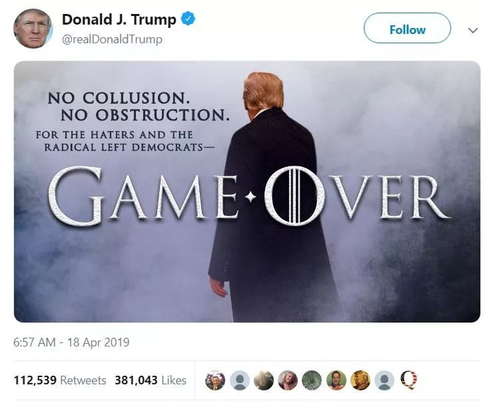 昨天特朗普用电视剧《权力的游戏》图片发推:GameOver(游戏结束)。