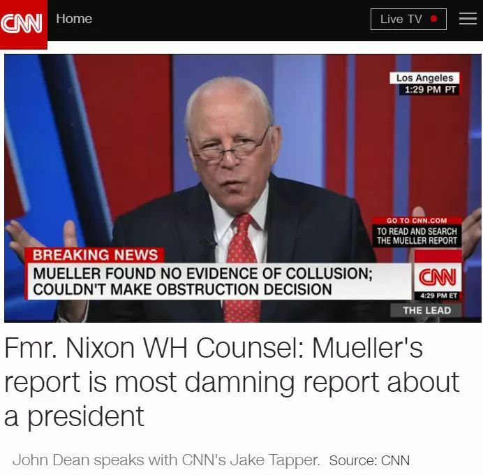 前尼克松总统时期的白宫律师、水门事件中关键人物约翰·迪恩(John Dean)昨天在接受CNN采访时说,他比较了穆勒报告和水门事件、伊朗门事件、克林顿时期的斯塔尔调查等所有针对美国总统的调查报告,他认为穆勒报告是所有里面对总统最为毁灭性的。