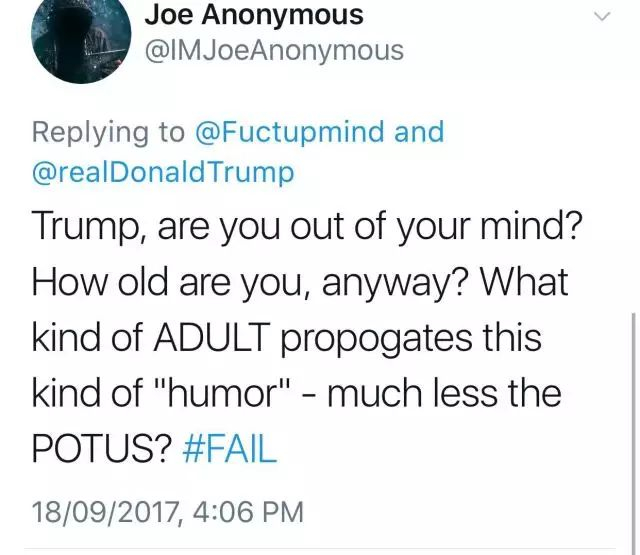 ▲“特朗普,你是丧失理智了吗?你都多大岁数了?就算不是美国总统,作为一个成年人会“传播”这种所谓的幽默吗?”