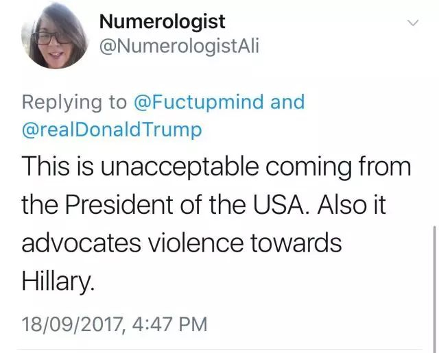 ▲“对于一名美国总统来说,转发这样的内容简直令人无法接受,并且这也是在倡导对希拉里这样的女性施暴。”