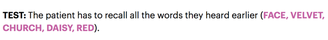 测试者要独自回忆,第五项中医生给出的5个词语(脸庞、天鹅绒、教堂、雏菊、红色),而且要根据非提示记分。