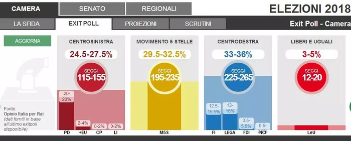 3月4日23时,意大利大选投票正式关闭。几乎是同一时间,意大利国家电视台(Rai)在23时10分左右便给出了的首份票站调查结果。结果显示,中右联盟以33-36%的支持率处于领先地位;五星运动党以 29.5-32.5%的支持率成为此次大选中排名第一的政党;中左联盟的支持率则相对较为落后:25.5-28.5%。