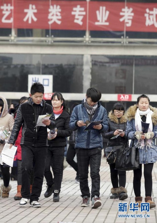 在山东省潍坊市富华国际会展中心设立的2014年省外高校艺术类专业考试潍坊考区报名处,学生们边走边看高校的招生简章(2014年2月8日摄)。近日,国务院印发《关于深化考试招生制度改革的实施意见》,部署深入贯彻落实党的十八届三中全会关于推进考试招生制度改革的要求,进一步促进教育公平,提高选拔水平。《实施意见》的出台,标志着新一轮考试招生制度改革全面启动。新华社发(张驰 摄)