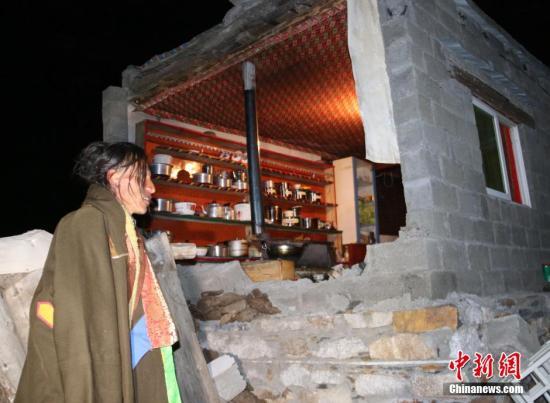 11月22日,震灾区一位受灾民众站在受损的房屋前。中新社发 钟欣 摄