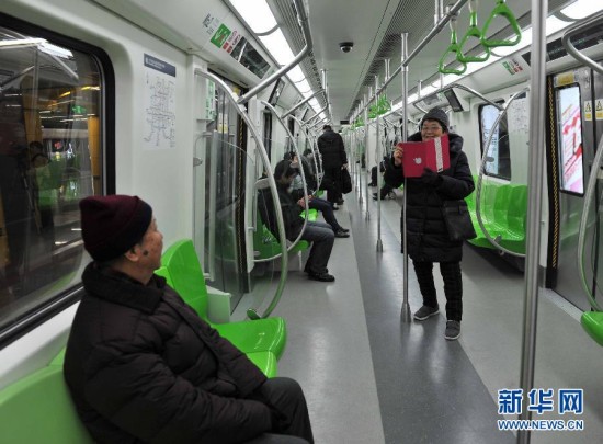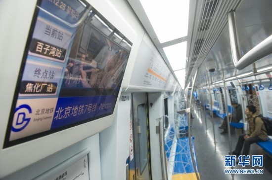 12月28日,新开通的北京地铁7号线车厢内还显得空荡。当日,北京地铁6号线二期、7号线、15号线西段、14号线东段开通试运营,北京的轨道交通运营里程再添62公里,共计达到527公里。新华社记者罗晓光摄