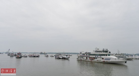 6月7日,江面上船只鸣笛致哀。当日,在湖北监利,“东方之星”号客轮翻沉事件救援现场举行哀悼遇难者活动,现场所有人员肃立默哀3分钟,船舶同时鸣笛3分钟。新华社记者白禹摄