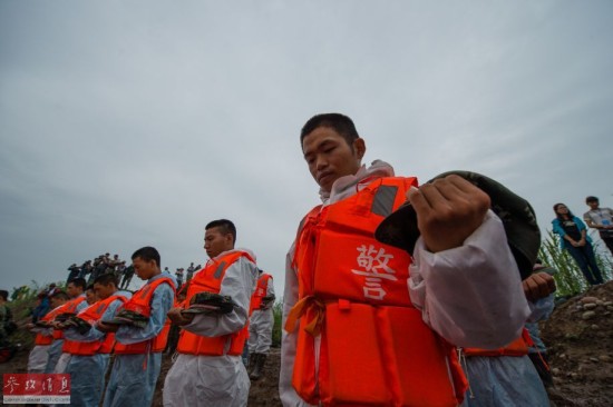 6月7日,在湖北监利,“东方之星”号客轮翻沉事件救援现场举行哀悼遇难者活动,现场所有人员肃立默哀3分钟,船舶同时鸣笛3分钟。新华社记者 肖艺九 摄?